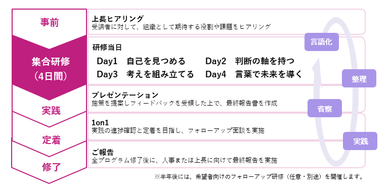 本スクールは、学びを気づきで終わらせず、現場での実践を通じてリーダーシップを組織に根づかせることを目的としています。