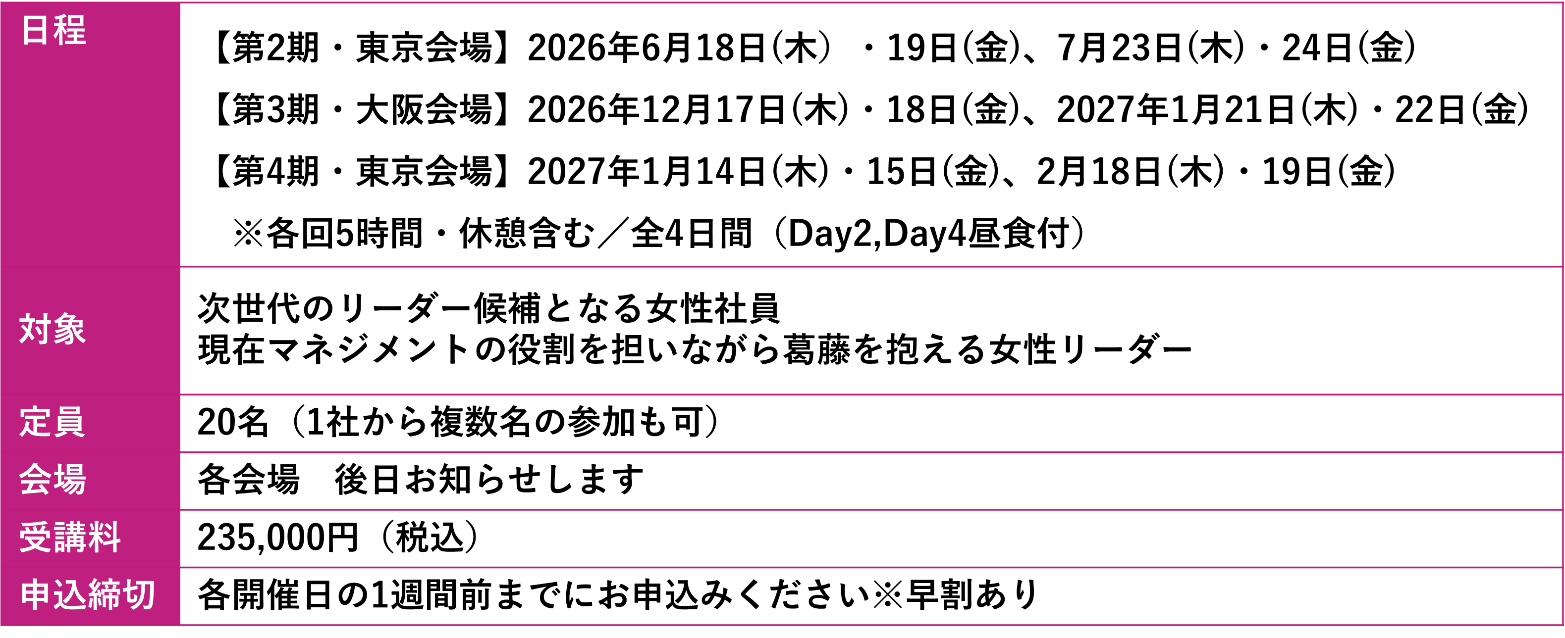 本スクールは、これからリーダーを目指す女性や、葛藤を抱える現役女性リーダーに向けて、女性特有の思考や価値観に寄り添いながら、マインドセットを整え、リーダーとして前向きに一歩を踏み出す力を育みます。